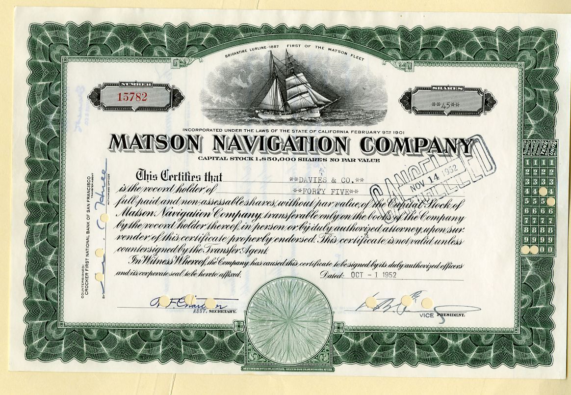 Matson Navigation Company Stock Certificate issued in the 1950's.
